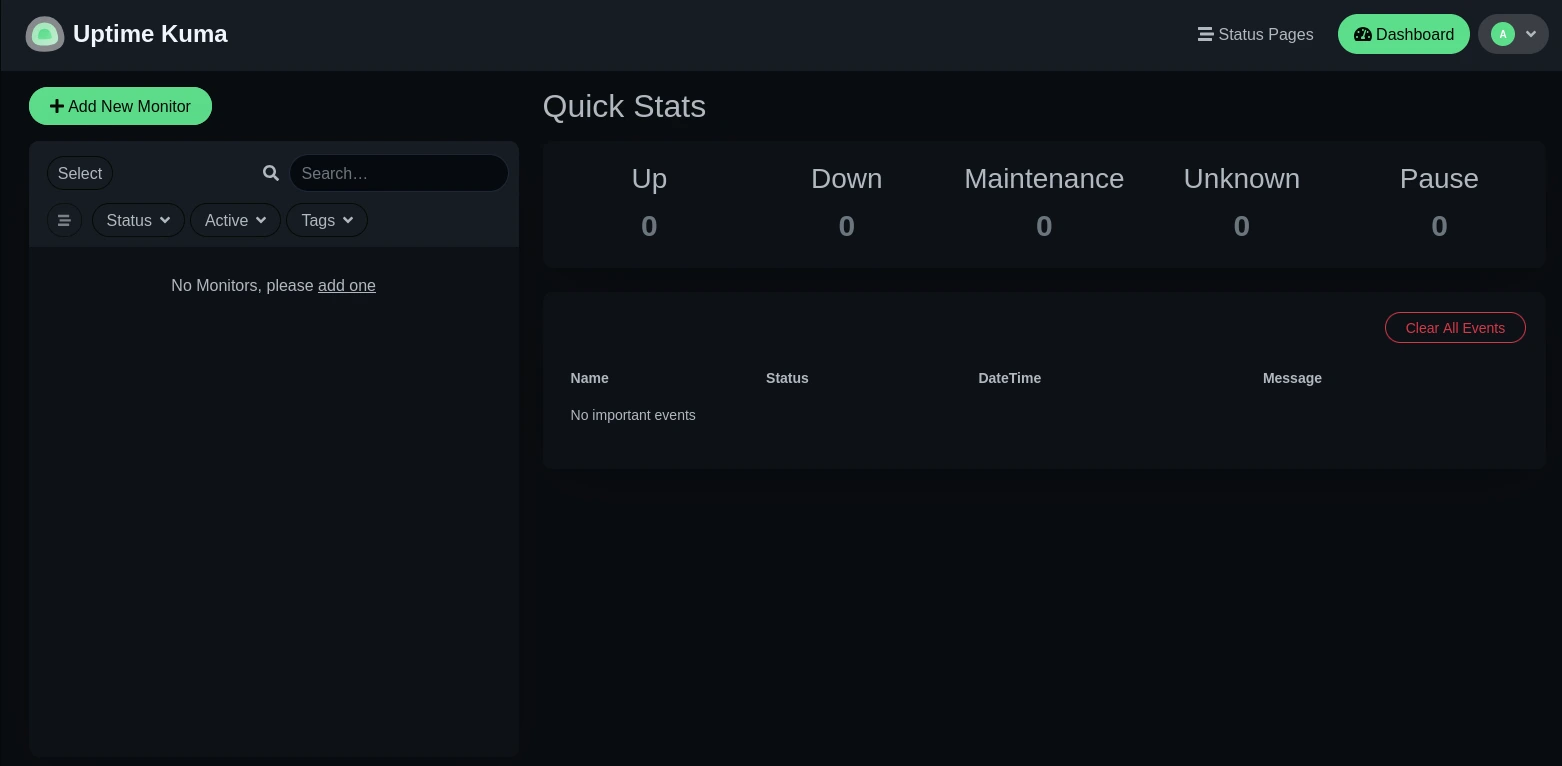Une fois le compte créé, on atterrit sur l'interface principale d'Uptime Kuma. C'est ici qu'il est possible de configurer toutes nos sondes et nos notifications, mais surtout de visualiser si tous nos services sont en ligne.