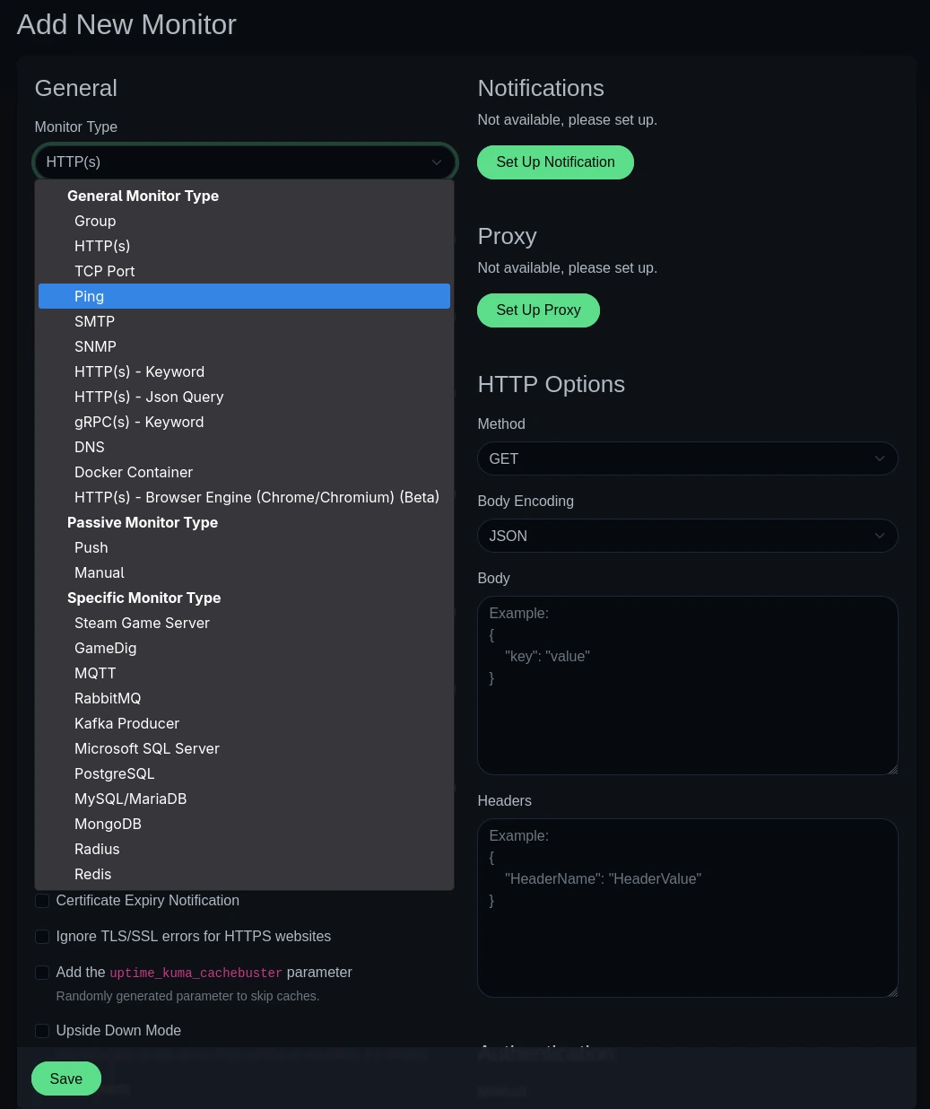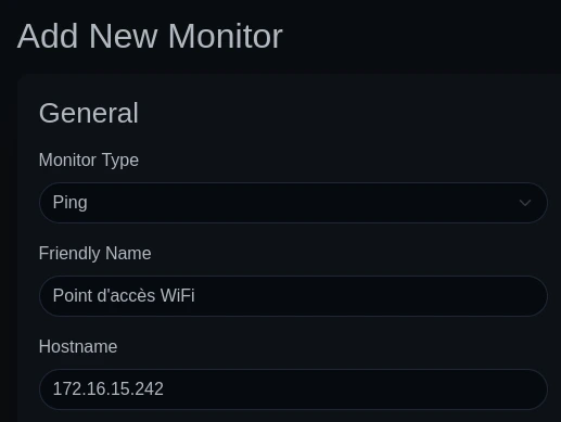 Pour créer une sonde, il suffit de cliquer sur le bouton "Add New Monitor" qui se trouve en haut à gauche de la page principale. On est ensuite présenté à de nombreuses options. Dans mon cas, je vais par exemple créer une sonde Ping afin de monitorer mon point d'accès Wi-Fi et être averti s'il tombe en panne.