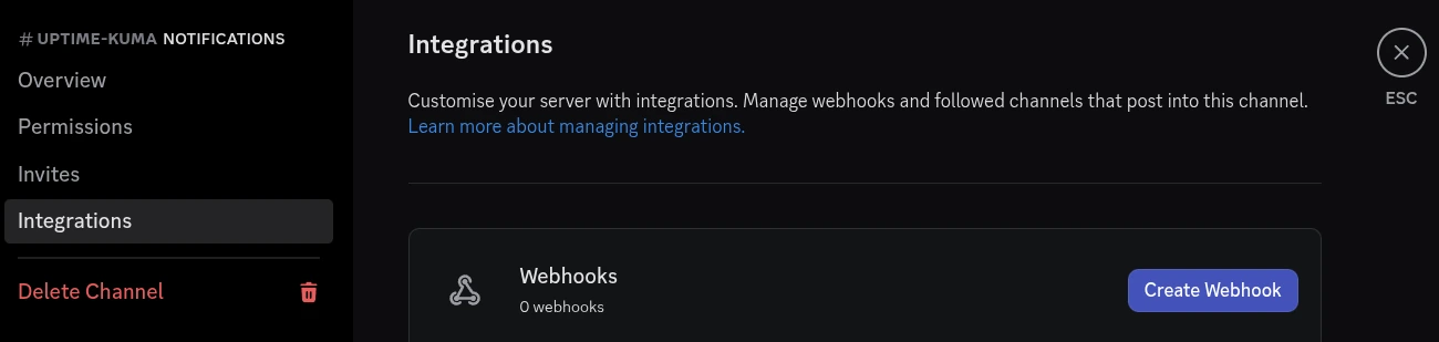 Pour commencer, il faut disposer d'un serveur Discord où l'on possède les droits d'administration. Je crée d'abord un salon textuel dédié à Uptime Kuma.