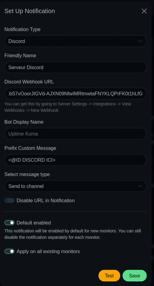 - Discord Webhook URL: Le lien du Webhook copié precedemment