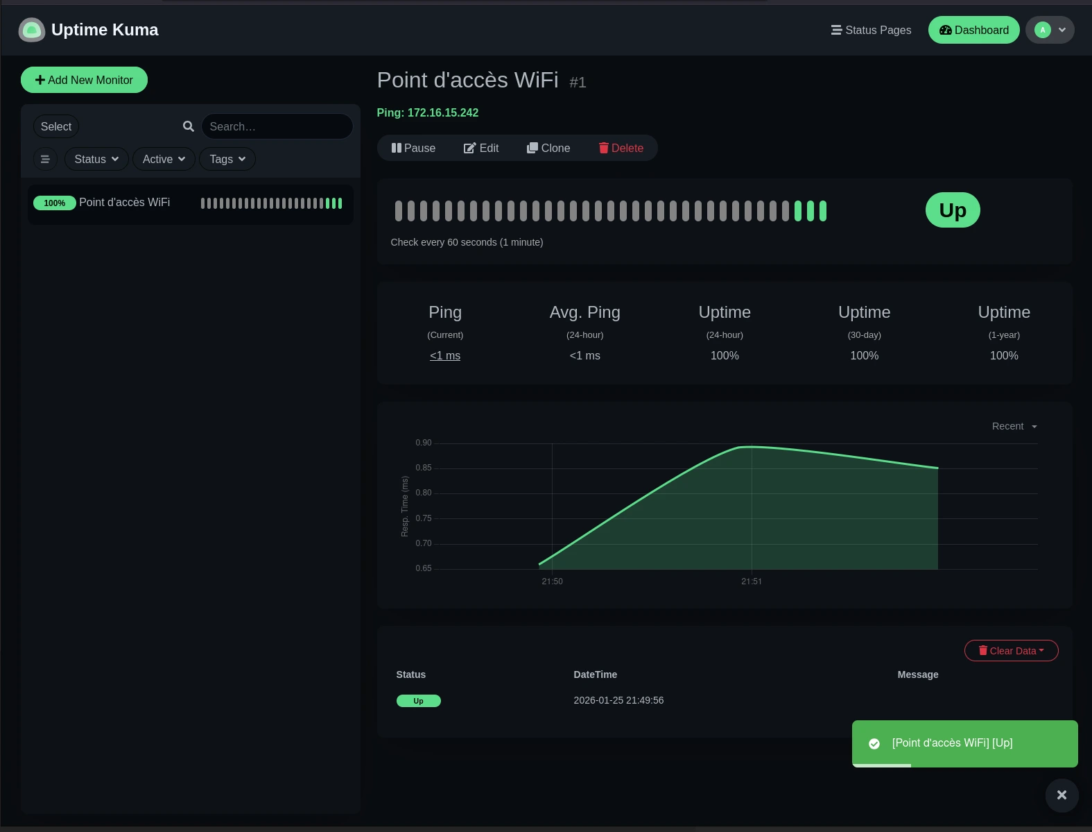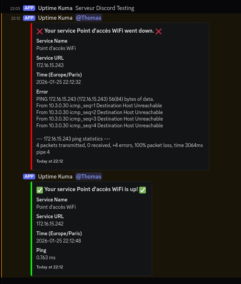 On constate bien que je suis notifié sur Discord lorsque la sonde n'arrive plus à pinger le point d'accès. De même, lorsque je rétablis la bonne configuration, je reçois une seconde notification m'indiquant que le service est de retour. Le système d'alerte est donc parfaitement fonctionnel.