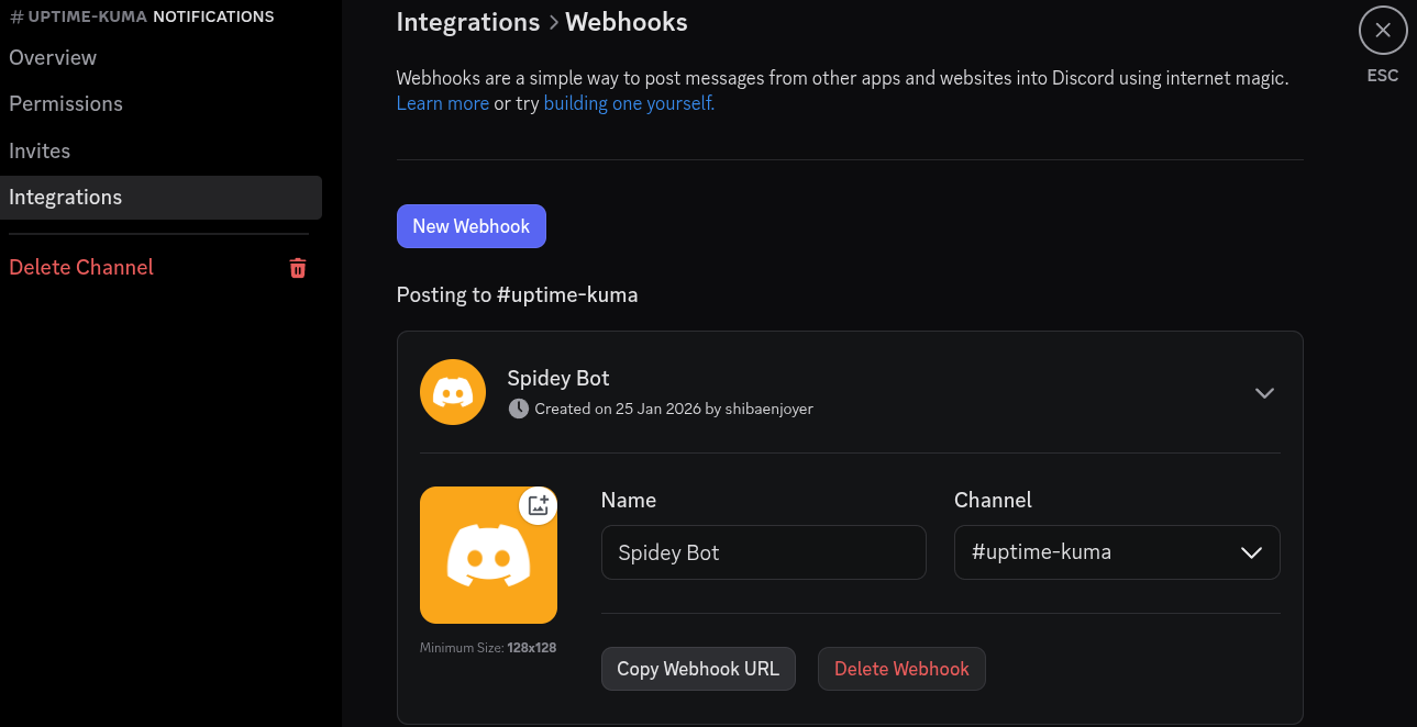 Ensuite, je configure le Webhook en me rendant dans les paramètres du salon, onglet Intégrations, puis en cliquant sur "Créer un Webhook". Une fois généré, je copie son URL (lien).